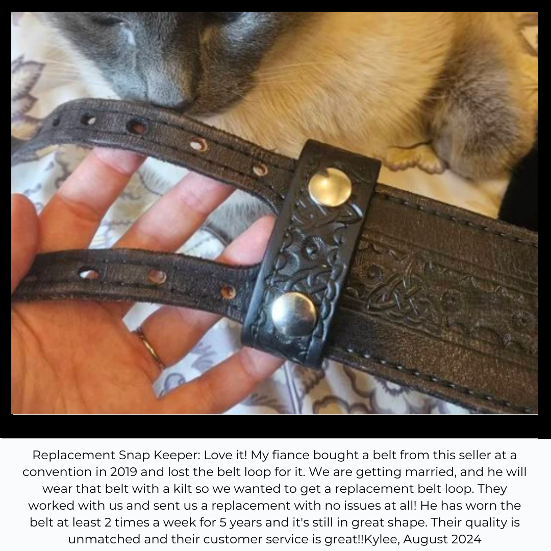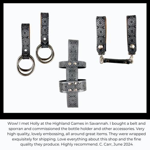 We hand make leather kilt accessories, festival gear & Celtic themed gifts. All of our leather products are designed by us and made in house, in our shop in Dothan, Alabama. We do not outsource our production.
